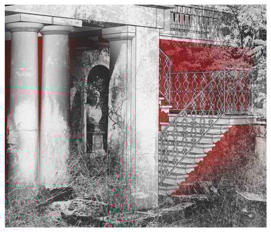 The Sarakina Mansion has overall exterior dimensions of 11.6 m × 85.50 m and is situated on a 30 m × 130 m plot (Figure 11). The central two-story section and its adjacent raised single-story wings housed the main residential areas. The ground floor, symmetrically arranged around the central passageway (“portego”), contained reception and living spaces, while the upper floor was dedicated to bedrooms. Flanking these were two elongated single-story wings used for essential agricultural and storage functions. The two long façades—the western side facing the maïstra (main access route) and the eastern side facing the woodland—featured a corresponding neoclassical design. According to Zivas, the western façade presented the mansion’s public image toward the village, while the eastern side maintained a more private character. Baroque decorative elements, such as the double columns in the courtyard, paired pilasters, and ornate lintels, combined with the building’s distinctive red walls, gave Sarakina a striking grandeur [].