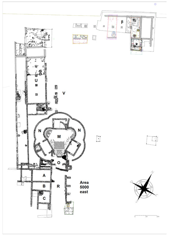During the archaeological excavation, an outstanding late antique villa was found: the main feature is a large central hall with three apses (M), surrounded by an ambulatio with five apses (N). A small vestibule (O) was set in the southern part of the room M. It was connected to a corridor, oriented north–south (R) and facing three rectangular rooms on the west side (A-B-C). From the corridor R towards the east, there were six small rooms (area 5000 east), where some pits with hundreds of sectilia glass fragments were found. The principal feature of the northwestern wing of the building is a large rectangular hall (U) that opened on the east side to an open area (V). Room β is the most recent discovery in the site: a huge room with six pilasters, with dolia still in situ, perhaps used as storage for edible items (such as wine) [25].