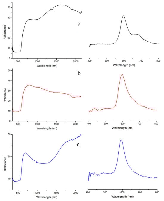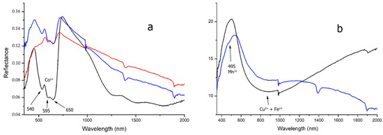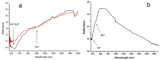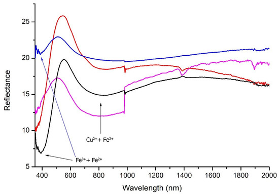 Due to the high transparence of the glass, the backscattered signal in the FORS spectra was very poor and only a weak absorption at 470–490 nm, due to Mn3+ and/or [Fe3+O3S2−]5− complex, was detectable [38,39]. In a few spectra, the presence of Fe2+ absorption band in the NIR region was also observed [40].