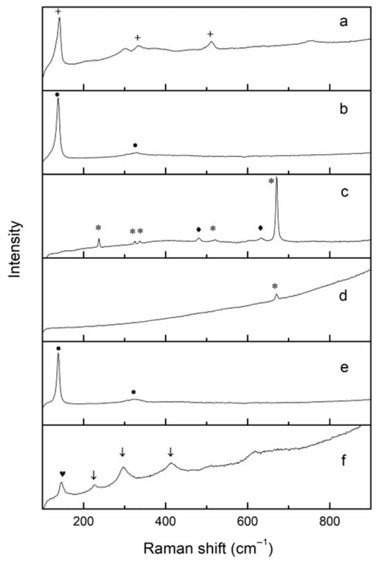 Examples of Raman spectra of differently colored samples from various stratigraphic units: (a) Ym5 US1095_20, (b) Y1 US5015, (c) W4 US1095, (d) LB3 US1095_20, (e) R6 US1095, (f) EG9 US1095. The symbols refer to bands due to opacifiers: + lead antimonate Pb2Sb2O7, • lead stannate Pb2SnO4 type II, * calcium antimonate hexagonal CaSb2O6, ♦ calcium antimonate rhombic Ca2Sb2O7, ♥ titanium oxide TiO2 (anatase), ↓ iron oxide, hematite Fe2O3.