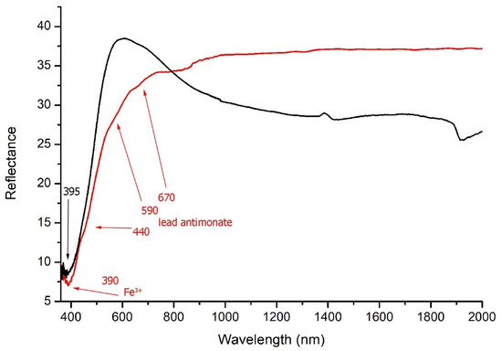 In contrast, the high-Sb series was mainly represented by samples from US 1095 and could be characterized by a general increase in Sb (up to 0.40 wt%) followed by a progressive decrease in Sn (0.03–0.28 wt%), with Pb ranging between 1.67 and 8.56 wt%. The Raman spectra (Figure 3a) showed a strong band at 510 cm−1 related to the stretching of the SbO6 octahedra, together with weaker bands in the range 200–400 cm−1 assigned to vibrational modes of both Sb–O and Pb–O bonds. The presence of a strong peak at 140 cm−1 was related to the Pb–O lattice vibration modes. The FORS spectra (Figure 5, red line) were characterized by the typical absorption bands of Fe3+ and Fe2+, respectively at 390 nm and 1040 nm. An intense signal at 440 nm, together with a shoulder at 590 and a further, but less intense, band around 670 nm, were related to the presence of lead antimonate [51].