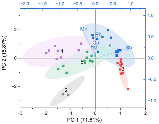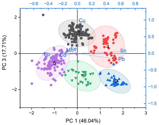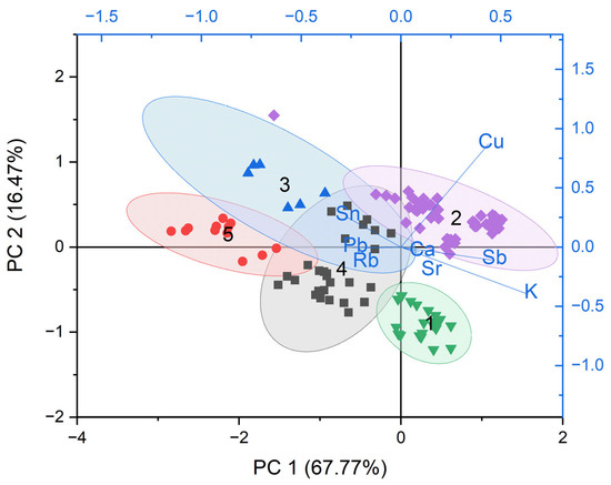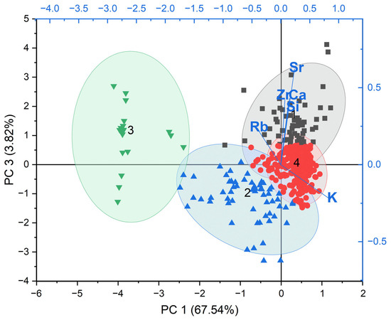 Origin 2024 was used to perform PCA and k-means cluster analysis of the semi-quantitative data. PCA analysis was performed on log10 transformed data in order to compensate for differences in magnitudes between the major elements and the trace elements [31]. The Factor Analysis and Optimal Cluster Number plug-ins were, respectively, used to identify key variables for PCA—to capture dataset variability—and to determine the most appropriate number of clusters for the k-means analysis.