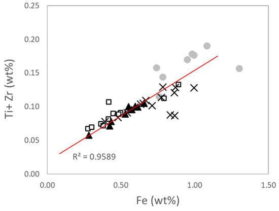 Rubidium and strontium, specifically, are more sensitive to differences between batches [33,34,35]. High values of Sr were commonly detected in Roman glass because of the widespread use of seashells as a source of carbonates. A high Sr/Rb ratio was detected in all the samples belonging to deeply colored glass tesserae, as well as dark blue (DB), light blue (LB), emerald green (EG), TU (turquoise), W (white) and transparent ones. Some green (G) and red (R) tesserae from unit 1095 also showed a similar Sr/Rb ratio.