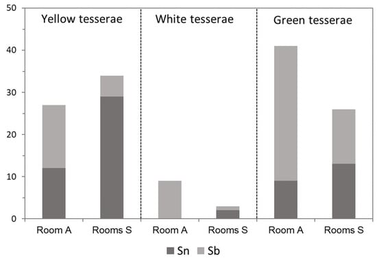 Most of the transparent tesserae (23 fragments) revealed the typical features of a mixture of Egyptian Sb- and Roman Mn-decolored glass due to recycling activities. Three different sub-groups were also identified according to an average Sb/Mn ratio, respectively, of 1.9, 0.6 and 0.1 (Figure S3).