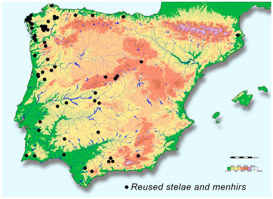 Another idea that has ruled the interpretation of menhirs is their maritime geography. This is inseparable from the assumption that megaliths are evidence of their own dissemination in Atlantic contexts, akin to the hypothesis an Atlantic pioneer group proposed since the early discoveries in the 19th century [42]. Conversely, Iberia, like some areas of France, shows a continuum of hinterland megaliths that spread across the entirety of its territory [43]. In fact, some of its maritime areas are documented to have a smaller number of menhirs. They are scarce in Galicia and northern Portugal, considering their rich megalithic contexts, one of whose components is the demonstrable reuse of previous stelae and menhirs. Other sectors stand out for the quality of their records, especially Catalonia, the Basque Country, La Meseta [44,45,46,47] and some southern territories [48]. Their absence in the southeast has been assumed, but just like in the previous case, we know of their reuse in megaliths and habitation sites [49,50]. This opens a future research field with very likely positive results.