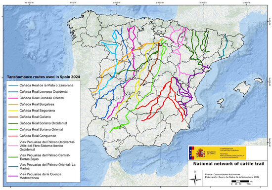 National livestock route network by the Spanish ministry, according to the General Network of Livestock Routes, within the Spanish Inventory of Natural Heritage and Biodiversity.