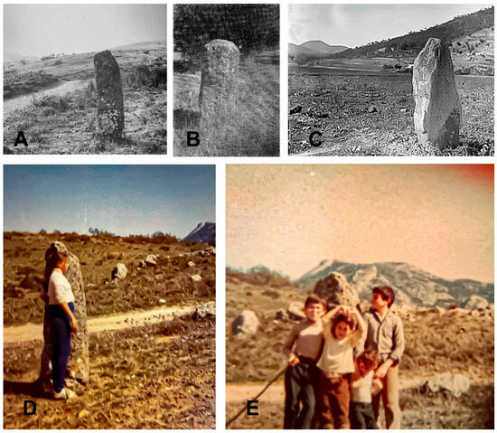 Old photographs of disappeared menhirs from the Antequera megalithic site: (A) Torreárboles menhir in the original location; (B) menhir from the necropolis of Alcaide, Antequera, according to Berdichesky [62]; (C) Piedra del Diablo menhir, taken by Manuel Gómez Moreno. Rodríguez Acosta Foundation, Granada; (D,E) Torreárboles landmark, in its original position, recorded by Gonzalbes Cravioto in 1986 [95].