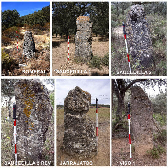 Romeral (menhir 1), Saucedilla 1 (menhir 2), Saucedilla 2 (menhir 3), Saucedilla 2 reverse (menhir 3), Jarrajatos (menhir 5), Viso 1(menhir 8).