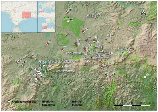 The Tierras de Antequera region holds a central position between the provinces of Málaga and Granada, in southern Iberia, with easy access to the mountain ranges of Córdoba. Its territory represents a major crossroads between the north and south of the Iberian Peninsula. Exhaustive knowledge of its ancient Neolithic settlement patterns [68,69] presents a rich inventory of collective burials in artificial subterranean structures and their latter reuse. These include dates from the Bronze Age and the Iron Age, as well as historical uses ([70,71,72], among others).