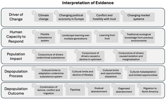 In the first step of analysis, we focus on the relationship between the hypotheses and drivers of decline. Figure 2 shows a summary of narrative themes, starting with the drivers of change and ending with the end-time scenario(s). A detailed table shows the narrative connections between driver, capacities to respond, population impacts, and processes and outcomes of settlement decline by each interview participant (see Table S1 in Supplementary Materials). This shows a broad consensus between researchers about the exogenous drivers of decline and the evidence of the adaptive strategies adopted by Norse settlers to mitigate such impacts. The subsequent impacts of these processes, at the end of the settlement period, differed between interview discussions. The most common hypothesis, adopted by nine interview participants, was the total abandonment of settlement by the mid-15th century. Eight of these scenarios involved the return to Scandinavian ancestral homelands and the North Atlantic islands and one explored the possibility of extension onto North America. Famine, loss at sea and cultural conflict were also discussed as end-time scenarios, where a remaining population died in situ as a result of climate impacts, economic (and social) isolation and/or hostility with the in-coming Inuit culture.