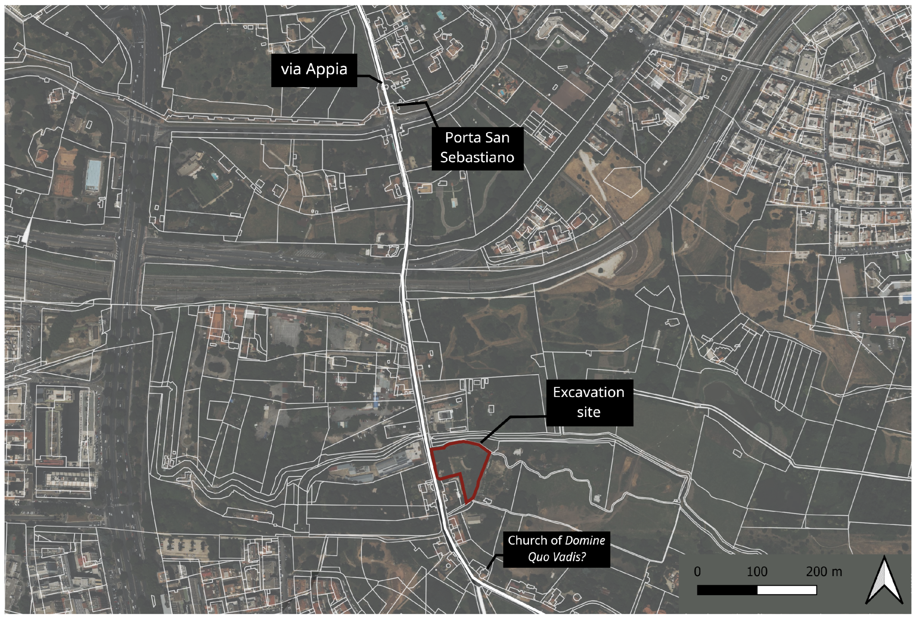1 | ABAP DD 679,31/05/2022. “Appia Antica 39” is an interdisciplinary project directed by Prof. Rachele Dubbini for the University of Ferrara. The archaeological excavation has been directed by Dr. Fabio Turchetta, “Ditta ARCHEO, Archeologia e tecnologie”. For more information on the project see [1], also https://linktr.ee/appiantica39, accessed on 15 June 2025. |