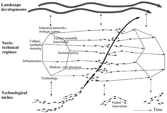 - Geels, F.W. Technological transitions as evolutionary reconfiguration processes: A multi-level perspective and a case-study. Res. Policy 2002, 31, 1257–1274. [Google Scholar] [CrossRef]