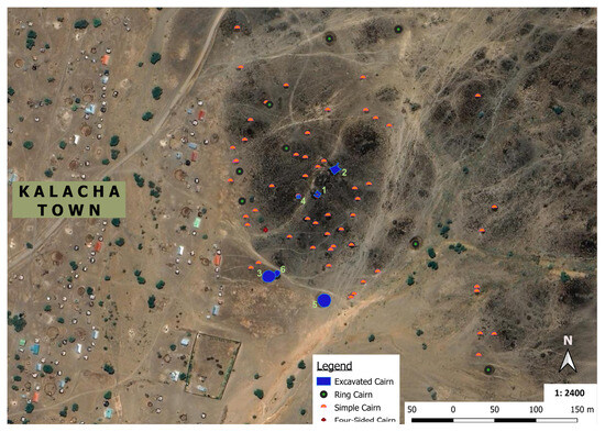 By contrast, other areas of Marsabit County east of Lake Turkana have received much less archaeological attention. Previous research around North Horr, ca. 90 km east of Lake Turkana and at the northern end of the Chalbi Desert, identified several, partially deflated scatters of lithics, pottery, faunal remains, ostrich eggshell beads, and other artefactual remains dating from ca. 5000 to 600 BP [,,]. The very fragmentary faunal material includes a mix of cattle, ovicaprids, zebra, gazelle, and unidentified large wild bovids. Surveys around the margins of the Chalbi Desert have also identified dense clusters of stone cairns of various types, with the most common types being simple cairns and ring cairns. A small sample of those on Kokurmatakore Hill on the outskirts of Kalacha have been excavated [,,]. The available radiocarbon dates suggest that the cairns were built and used over several centuries between ca. 3500 BP and 125 BP, with the earliest type (simple mound) likely associated with PN communities. Dated material associated with the ring cairns yielded a range of dates from the fourteenth to nineteenth centuries CE, while the platform cairns appear to date to the late first- to early second millennium CE. The excavators thought these might relate to an early incursion of Oromo speakers into Northern Kenya, while the ring cairns were thought to have been erected by either Eastern Cushitic or Nilotic speakers [].