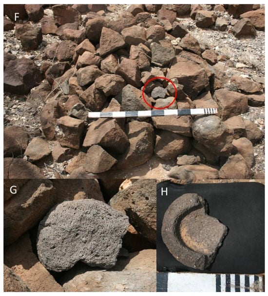 Examples of different types of stone cairn found around Kalacha and Korole, Marsabit County, Kenya: (A) Simple mound. (B) Excavated burial, El Muda, scale 40 cm. (C) Kerbed cairn, scale 40 cm. (D) Detail of stone kerb, scale 40 cm. (E) Drone photo of a ring cairn, Korole. (F) Small, simple cairn with broken Pastoral Neolithic stone bowl (circled), scale 50 cm. (G) Detail of a broken Pastoral Neolithic stone bowl on a simple cairn. (H) Pastoral Neolithic stone bowl from surface of a small, simple cairn, scale 20 cm. (Photos: Paul Lane; drone photo: John Kanyingi, BIEA).