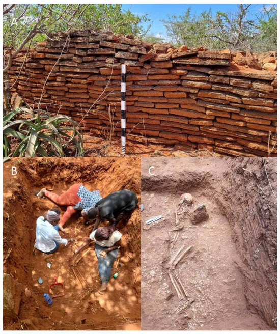 Archaeological research in Southern Ethiopia in 2022: (A) Example of stone walling at Dawiti Melbana. (B) Excavations in progress at Dibu Sako. (C) Excavated burial at Dibu Sako. (Photos: John Kanyingi, BIEA).