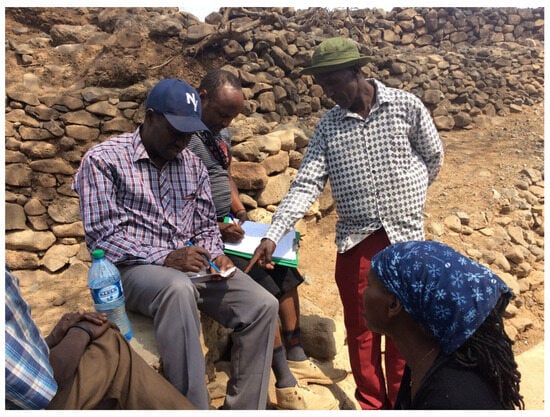 The teams were also involved in ethnohistorical and ethnoarchaeological research with community leaders, elders, and other community members aimed at collecting data about these cultural landscapes, water management practices, and the functioning of a pastoral economy (Figure 7). Community focus groups were held around each well cluster. In addition, individual members of the community and especially people who are directly involved in water management—the Abba Erega and Abba Konfi, including the retired ones—were interviewed. Other than the water managers, women, and individual elders, a sample of individuals respected by their communities as key heritage knowledge keepers were also interviewed. Our interviewees also provided information regarding their perceptions of archaeological sites, rock art, and monuments in the region. Their responses indicated a widespread lack of awareness about most of the archaeological sites in their localities and their historical significance. It was also clear that the contemporary cultural sites enjoy a degree of community protection, although, with the dwindling of the authority of traditional institutions and the growing influence of external actors in the form of governmental, non-governmental, and religious organisations, the maintenance of socio-ecological systems has been weakened. These interactions also served as avenues for talking with participants about climate change, the dangers it poses to these archaeological sites, and their potential roles as stewards of this heritage. While these interviews provided information for helping answer our research questions, they also gave our community trainees, who were mostly young or early middle-aged, the chance to learn more about their cultures and landscapes.