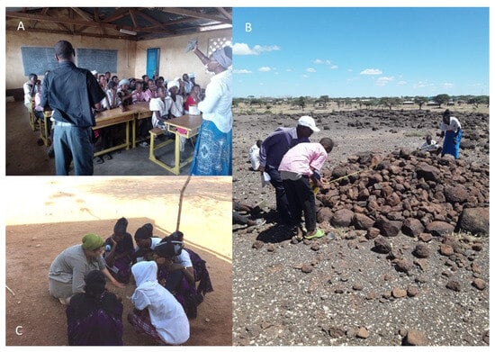 Heritage Club activities in Kalacha: (A) Freda M’Mbogori explaining stone tool use to primary school students, Rage Primary School, Kalacha. (B) Katelo Abduba instructing Rage Primary School Heritage Club students in measuring a stone cairn within their school compound. (C) Ella V. Beaudoin working with students at Kalacha Girls Secondary School, August 2023. (Photos: (A,C) Paul Lane; (B) John Roba).
