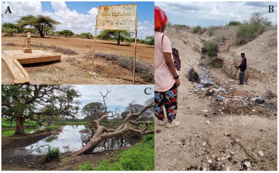 (A) Abandoned modern borehole well, Gayo, Ethiopia, April 2022; (B) litter-strewn abandoned well at Wachille, Ethiopia, April 2024; (C) flooded well, Dubluq, Ethiopia, April 2024 (photo credit: Freda Nkirote M’Mbogori).
