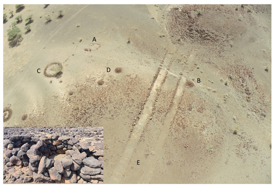 Drone image of cairns north of Kalacha, showing damage from recent foora construction (A) and geological exploration work (E linear bands), including partial damage to a cairn (B). C = ring cairn, D = simple kerbed cairns; inset—example of a foora goat pen, June 2022. Photo credits: John Kanyingi/BIEA.