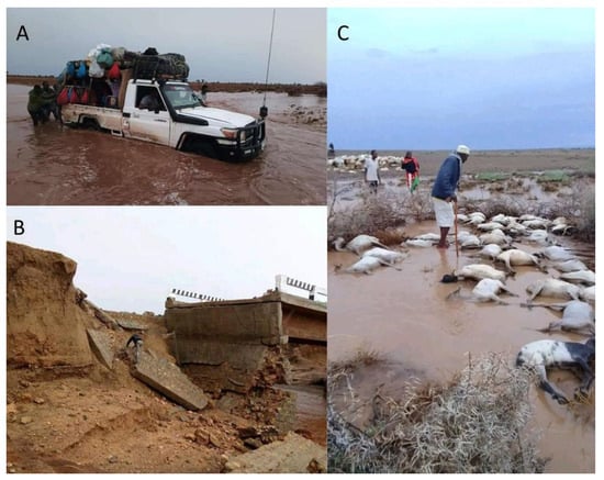 Our own research suggests this indigenous knowledge is deeply woven into the fabric of Gabra and Borana communities in Southern Ethiopia and Northern Kenya, and often finds expression in rituals and ceremonies throughout life’s stages. This knowledge is also transmitted to future generations, forming a strong foundation for their epistemologies and agency. Traditional leadership systems, such as the Luba among the Gabra and Gada among the Borana, play an important role by coordinating grazing committees and village meetings and directing routine monitoring of grazing and watering locations. Individual mitigation strategies include sustaining social exchange networks and stock-friendships that allow herds to be split between different localities during periods of drought, thereby spreading the risks of stock loss []. These institutions are reported to have contributed to maintaining socio-ecological resilience during previous ecological crises [,,,,]. Likewise, oral histories document significant environmental events, like floods, droughts, and locust invasions, among others [,,]. These records chronicle the devastation caused by these events and the measures taken for mitigation, adaptation, or recovery.