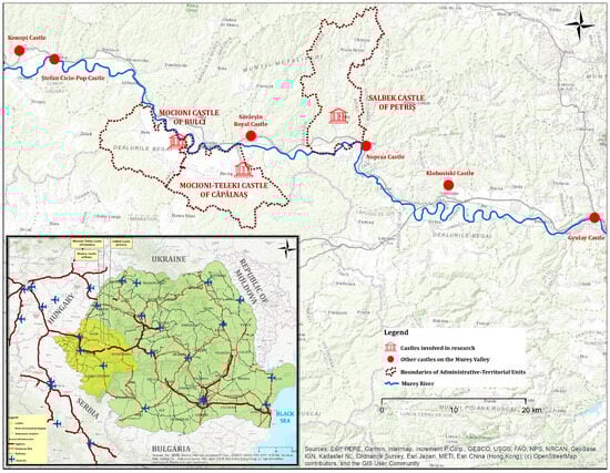 The three castles analysed in this study are located in western Romania, on the lower course of the Mureș River, in Arad County, approximately 150 kilometres from the border between Romania and Hungary. This region of the valley predominantly features a rural character, with the nearest town being Lipova, which has a population of approximately 10,000 inhabitants []. The county seat, Arad, is situated approximately 100 kilometres away []. However, the location is highly accessible due to its proximity to major transportation infrastructure. The entire corridor is situated along a significant national and European road (E68) and on a railway line that connects the capital cities of Bucharest and Budapest. The two castles under consideration are located to the south of the Mureș River (Bulci and Căpălnaș), whilst Petriș Castle is situated to the north. In addition to the three castles under scrutiny in this article, there are six other castles in the area, all located within a maximum distance of 5 kilometres from the river (see Figure 1). These edifices, frequently situated in a strategic manner on the gentle or hilly banks of the Mureș, functioned not only as aristocratic residences but also as centres of decision-making, culture and social representation.