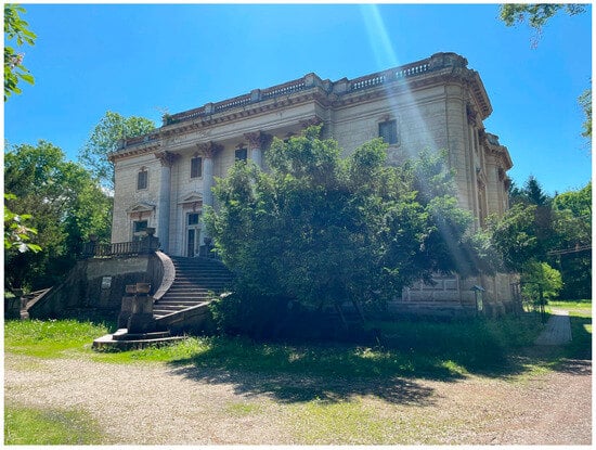 The Mocioni-Teleki Castle in Căpâlnaș (see Figure 3) was built in the second half of the 19th century by the Mocioni family, modelled after the Petit Trianon in Versailles, in the middle of an 8 hectare estate []. After the establishment of communism, the castle became a psychiatric hospital until 2025. The castle grounds also include a memorial site with the burial crypts of members of the noble family. Today, the castle is owned by descendants of the noble families, is listed on the national list of historical monuments under code AR-II-a-A-00594 [], and has been up for sale for several years.
