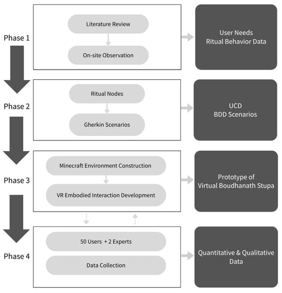 Religious cultural heritage sites serve as vital vessels of cultural memory, often embodied through spatial, emotional, and performative bodily ritual practices. More importantly, they are key venues for fostering intergenerational transmission, helping to reinforce cultural identity and pass traditions on to younger generations. Among many sacred sites, the Boudhanath Stupa in Kathmandu, Nepal—recognized as one of the largest Buddhist stupas in the world and inscribed as a UNESCO World Heritage Site—has long been a major pilgrimage destination. Devotees engage in fully embodied ritual actions here, such as circumambulation (kora) and offerings, and refer to it as the “Wish-Fulfilling Stupa” [1,2]. However, contemporary challenges—such as travel restrictions caused by the pandemic, economic hardship, and physical disabilities—have severely disrupted the possibility of in-person pilgrimage, further prompting interest in virtual pilgrimage alternatives [3,4]. While 3D scanning and immersive visualization technologies have enabled the rapid digital preservation of cultural heritage [5,6,7], most existing systems remain predominantly passive and display-oriented, lacking support for the interactivity and ritual authenticity essential to religious participation. Conversely, developing highly interactive, fully customized virtual ritual environments often requires a significant financial and time investment, making them difficult to scale and reuse [8,9,10]. In particular, the intended audiences of this study include those who wish to experience a Buddhist sacred site but are unable to travel, as well as those who have already visited the Boudhanath Stupa and seek to revisit their experiences. To address this gap, this study proposes a prototype design model for a culturally sensitive, ritual-oriented virtual pilgrimage environment. The approach integrates user-centered design (UCD) [11] and Behavior-Driven Development (BDD) [12] to move beyond a static spatial representation and enable meaningful, participatory engagement. Using the Boudhanath Stupa as a case study, the model is implemented on an accessible Minecraft–VR platform. Minecraft has frequently been used for cultural heritage due to its accessibility, making it suitable for broad audiences. In contrast, VR provides the embodied immersion sought by participants desiring ritual authenticity. Together, the Minecraft–VR approach balances accessibility with depth of engagement. The development process comprises four phases, with the fourth dedicated to evaluation, as summarized in Figure 1.