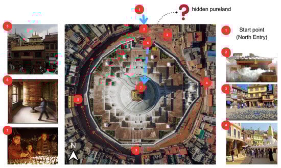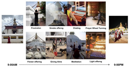 In Buddhism, the stupa is a sacred architectural structure built to enshrine the relics of the Buddha, serving as a central place for devotion, ritual activities, and spiritual practice. Its canonical basis derives from the Buddha’s teachings in scriptures such as the Dirgha Agama Sutra, which emphasize the establishment of reliquary stupas as a means for public veneration and inspiration for future generations [13]. The term stūpa can be traced linguistically to the Vedic period. According to Giuseppe Tucci, its original meaning was “heap” or “elevation”, and it was often used to denote altars symbolizing the connection between heaven and earth [14,15]. Architecturally, early stupas such as the Sanchi Stupa feature a hemispherical dome (anda) set upon a circular base (medhi), with a circumambulatory path (pradakshina patha), embodying cosmological symbolism from both Buddhist and pre-Buddhist traditions [16]. Among many sacred sites, the Boudhanath Stupa in Kathmandu, Nepal, holds a particularly significant religious and cultural position . The structure itself is a three-dimensional mandala, with each architectural element symbolizing a spiritual path toward awakening: the large white dome represents water, the thirteen-tiered golden spire signifies the stages of spiritual progress, and the four all-seeing eyes of the Buddha face in all cardinal directions [17]. It stands as the spiritual heart of the Nepali Tibetan Buddhist community, not merely as a historical heritage site but as a living, continually enacted space. Each year, hundreds of thousands of devotees engage here from sunrise to sunset in rituals such as circumambulation, chanting, prostrations, and offerings, making it living cultural heritage animated by collective faith. Ritual practices at Buddhist pilgrimage sites do not merely record meaning but actively produce it [18]. These embodied religious acts are not simply symbolic gestures but serve as essential means for devotees to internalize cultural values and cosmology. As Bourdieu states, “Space has no meaning without practice” [19]; thus, the sacredness of a stupa must be manifested through active participation and interaction. Among these, the most central ritual is circumambulation (pradakṣiṇā), performed by walking clockwise around the stupa with the right side facing it. This practice, which dates back to early Buddhism, is vividly depicted in reliefs at Borobudur and the Amaravati Stupa and explicitly recorded in scriptures such as the Sūtra on the Merits of Circumambulating a Stupa [20,21]. It is believed to generate immeasurable merit, including liberation from suffering, the accumulation of virtuous karma, and the attainment of both worldly and spiritual benefits. However, circumambulation is not merely an act of physical movement; it is an integrated practice that unites body, speech, and mind. Unlike tourists who walk around a stupa out of curiosity, devout practitioners recite mantras, chant sutras, and may even perform prostrations and make offerings during the process. Tibetan Buddhist master Dzongsar Khyentse Rinpoche likewise emphasizes that visiting sacred sites and dedicating one’s physical actions can accumulate vast merit [22]. Thus, the space surrounding a stupa constitutes a sanctified realm imbued with ritual energy, supporting practitioners in the continuous cultivation of both body and mind.