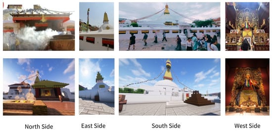 The construction of the Virtual Boudhanath Stupa began with spatial layout planning, with the primary design focus on ensuring strong connections to the real site. Drawing from the literature, architectural floor plans measured on site, data from Google Maps, and photographic documentation, we reconstructed the core structure comprising the hemispherical dome and the surrounding circumambulatory path at scale. Based on the previously defined seven primary ritual node framework, each virtual interaction node was aligned with its real-world counterpart (Figure 3), such as the ritual space at the north entrance and the Jamchen Lhakhang Monastery on the west side, thereby recreating the symbolic spatial relationships of the site. Through spatial alignment and the modeling of key Buddhist symbols (e.g., the Buddha’s Eyes), we aimed to create a virtual ritual environment rich in authentic elements and symbolic meaning. Although spatial and symbolic fidelity was achieved to a high degree, we adopted a dual strategy to address Minecraft’s inherent visual limitations. First, we used Minecraft Java Edition, which offers the most comprehensive support for third-party mods, and installed shader packs to significantly enhance the visual presentation, including realistic lighting, dynamic skies, and more textured materials. Second, for details that shaders could not adequately convey, we embedded high-resolution photographs from the actual site at specific ritual nodes. For example, when users reach a particular ritual interaction point, the interface displays real-life images of the local reliefs or surface textures. This hybrid approach combining game visual enhancements with real photographic media maximizes Minecraft’s strengths in spatial navigation while delivering a culturally contextualized and ritually rich experience. Figure 4 shows a comparison between the real and virtual environments, which was evaluated through user testing to understand its impact on the aesthetics of pilgrimage.