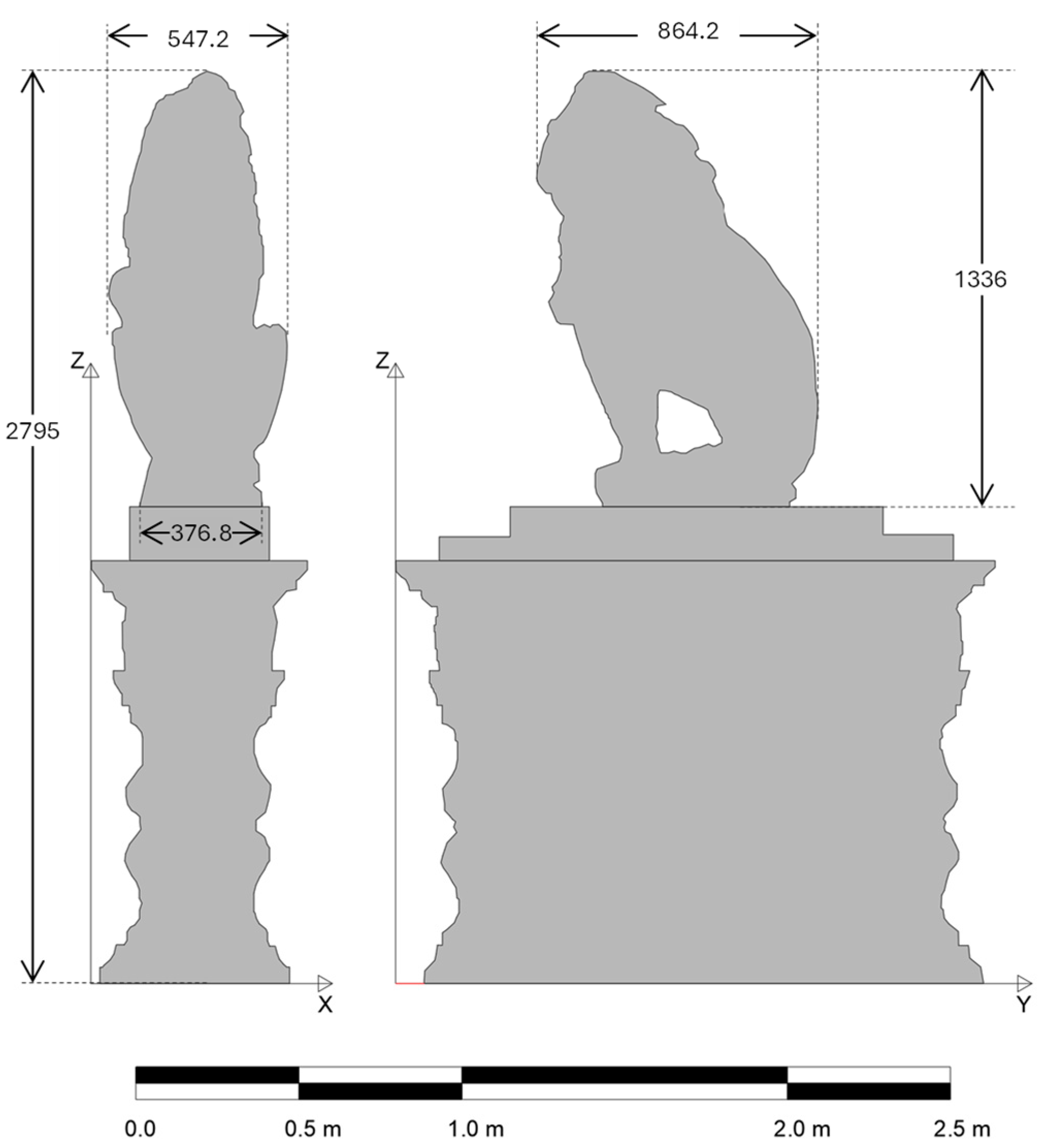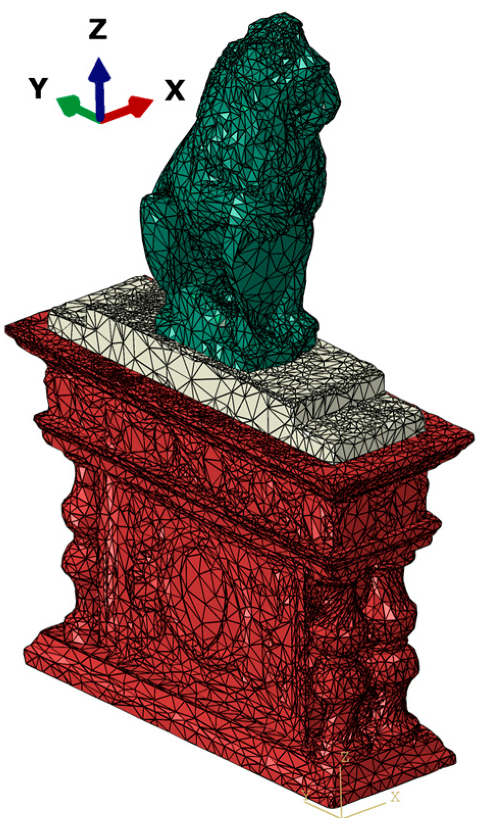 24], which is difficult to predict without specific information about the artwork setup. As regards Marzocco, it appears to be cemented to its base through mortar. This connection between sculptures and their pedestals was quite common in past centuries, and it presents high friction. For this reason, overturning has been considered to be the main collapse mechanism of the case study, and a proper structural model, allowing the detachment between the statue and its support, has been assumed for the numerical analysis. Such modeling is not the most suitable for representing the material degradation, which has not been studied in the current research.