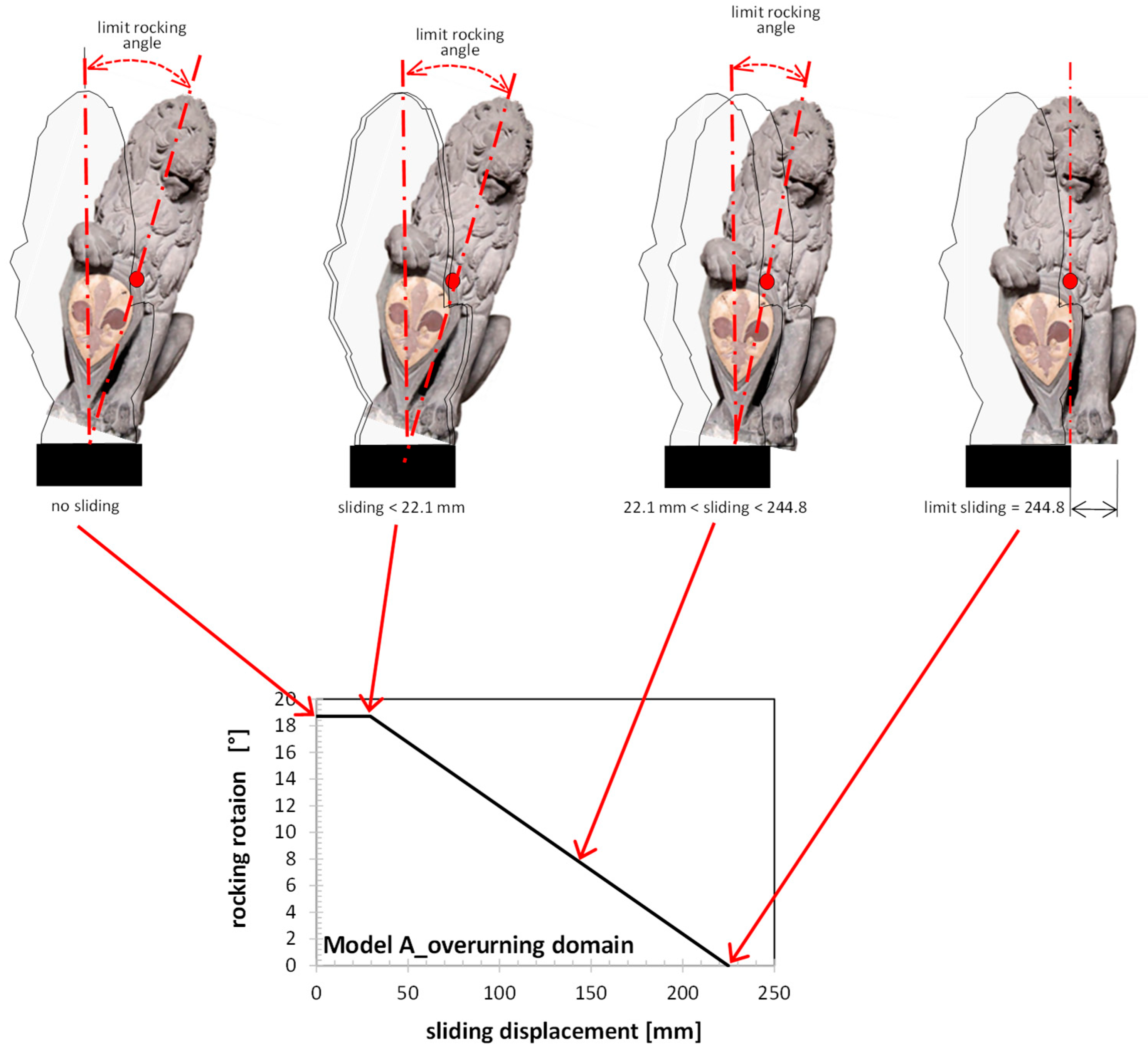 This work is focused on the combined occurrence of rocking and sliding. The considered case study is the artwork “Marzocco”, the stone masterpiece by Donatello, which is the heraldic symbol of Florence, currently exhibited at the National Museum of Bargello. It follows the investigation presented in Azzara et al. 2023 [