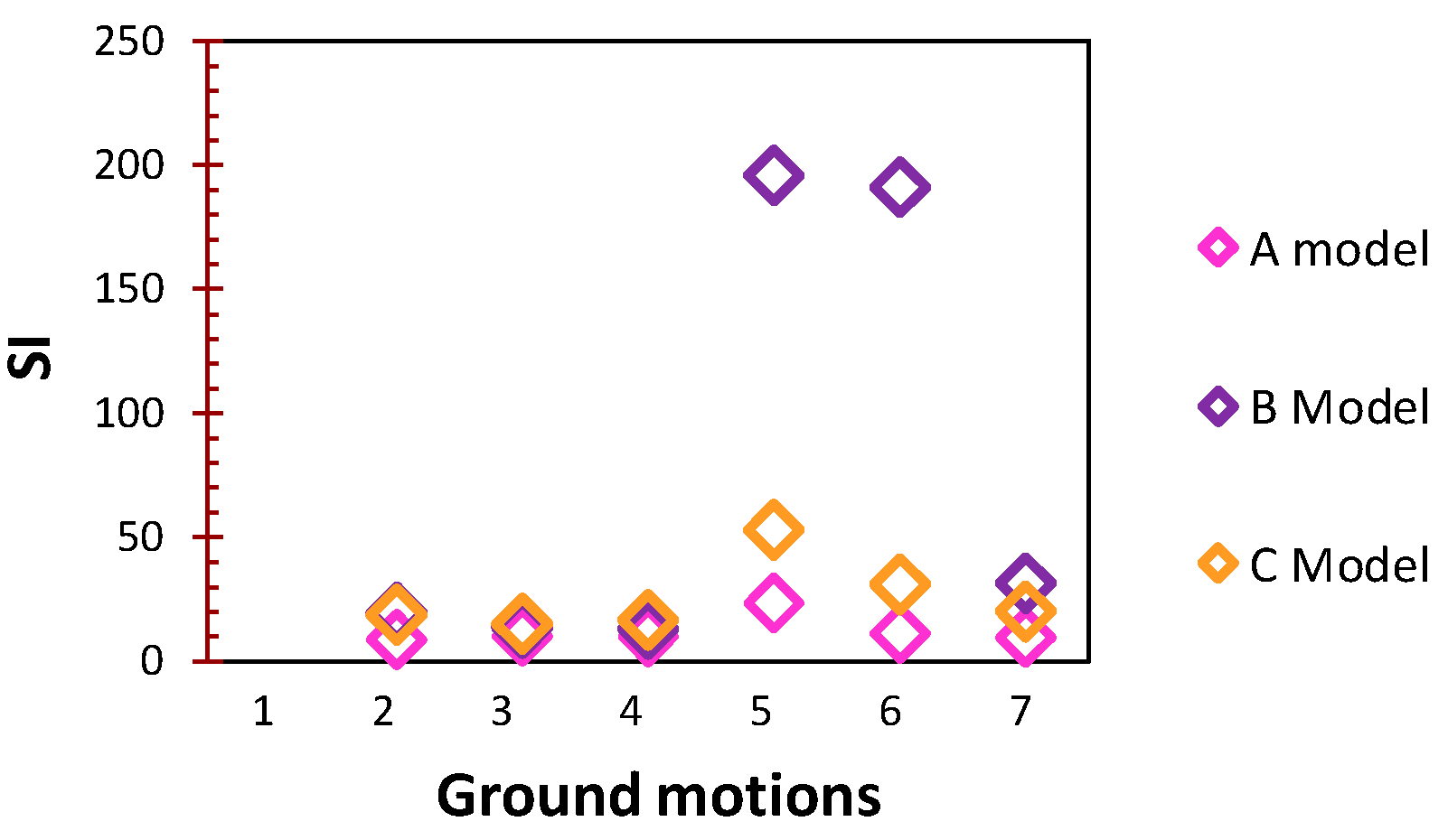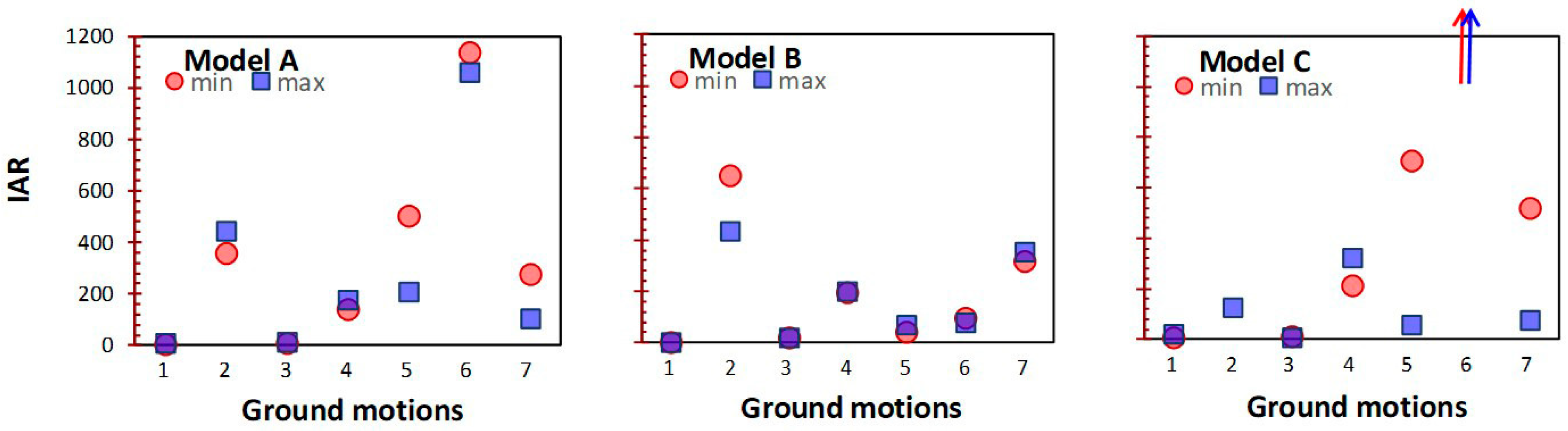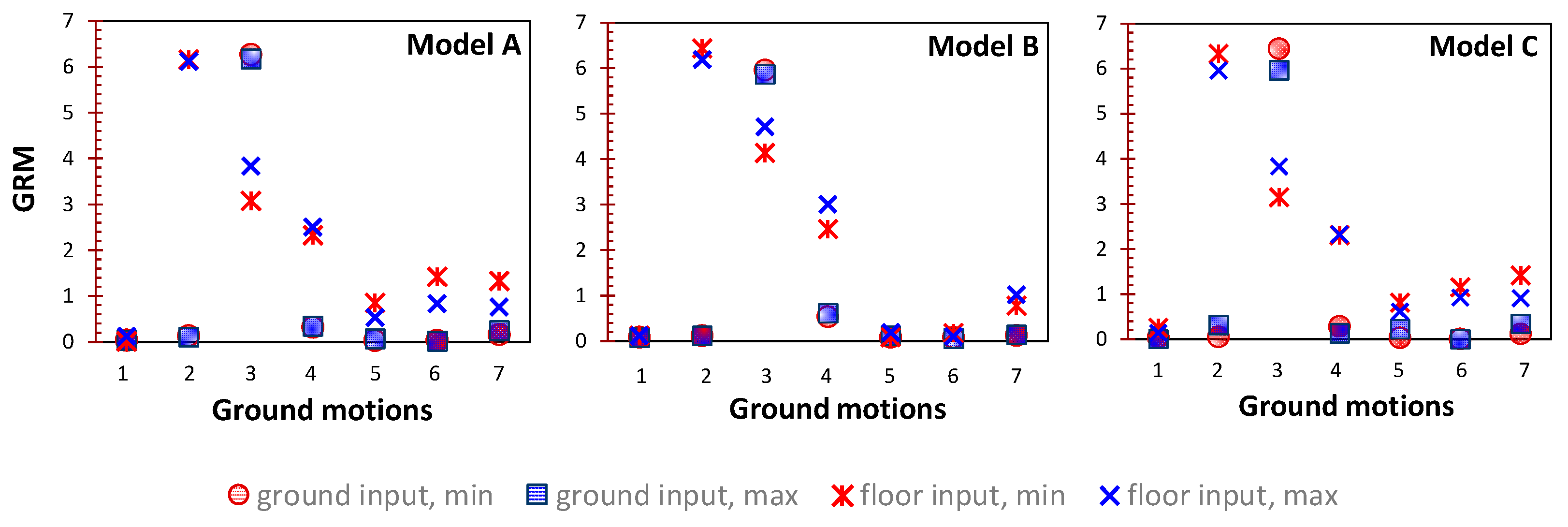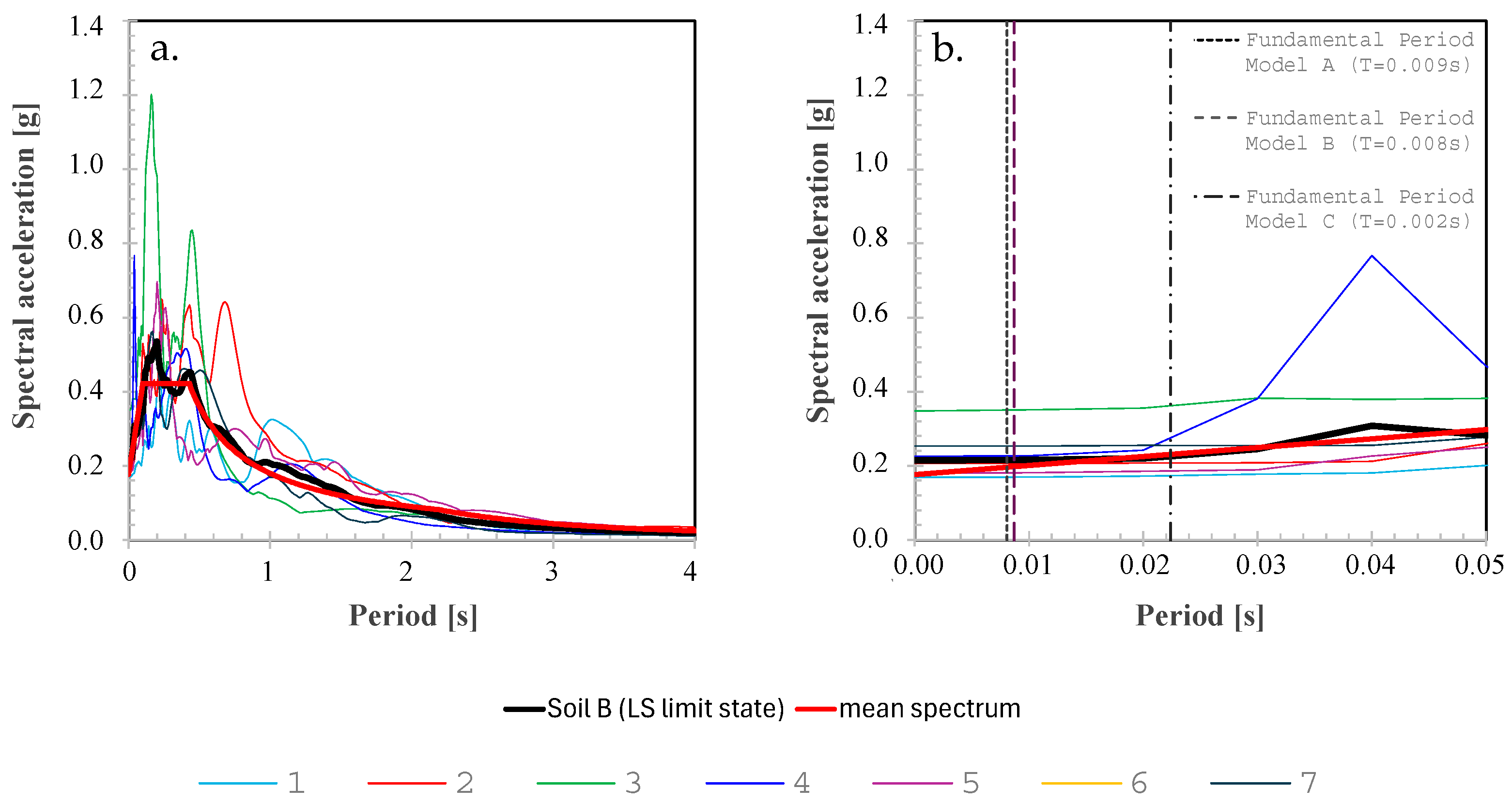 The seismic response of the three models has been found with reference to an ensemble of seven ground motions, spectrum compatible with the elastic response spectrum provided by the current Italian Technical Code for the Life Safety limit state (return period equal to 712 years) and a soil type B, whose PGA is equal to 0.1764 g.