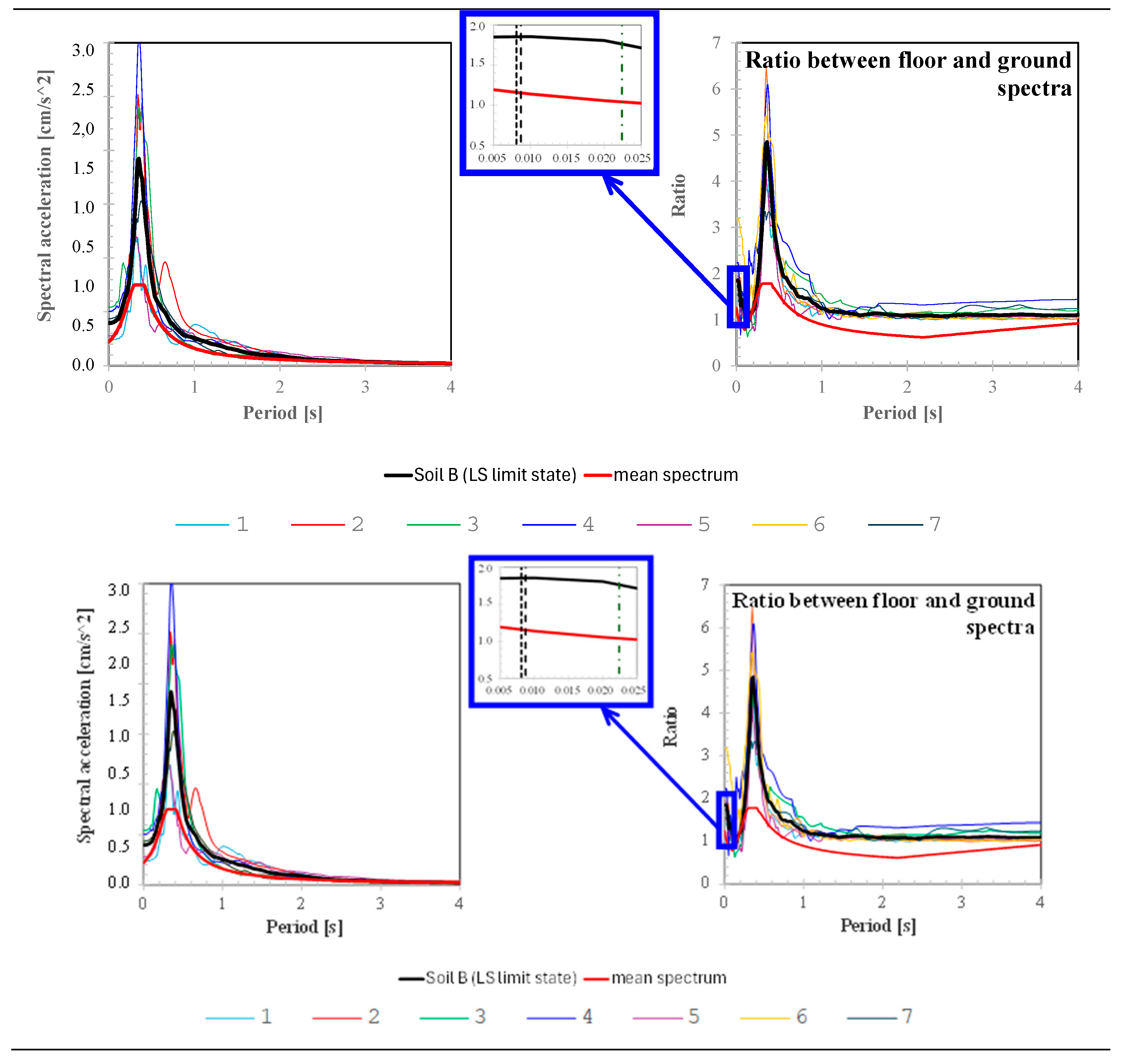 The seismic action on the first floor has been found accounting for the transfer-effect of the building by means of a simplified SDOF model having the same frequency as the building, i.e., T = 0.35 s. Such frequency, in turn, has been found by the Authors in a former investigation, through dynamic monitoring by means of seismic motions, as described in [