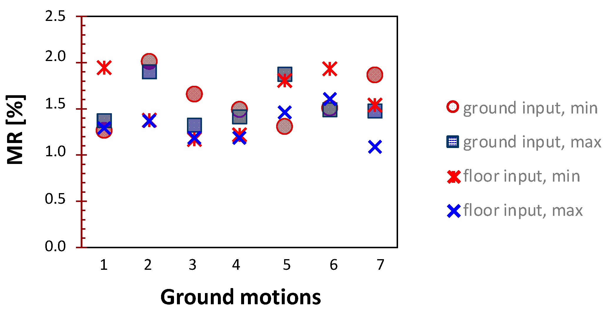 The response of the case study is largely affected by the considered ground motion (both the ground and the floor ones): some of the ground motions induce a maximum displacement 6 times larger than the mean displacement of the ensemble.