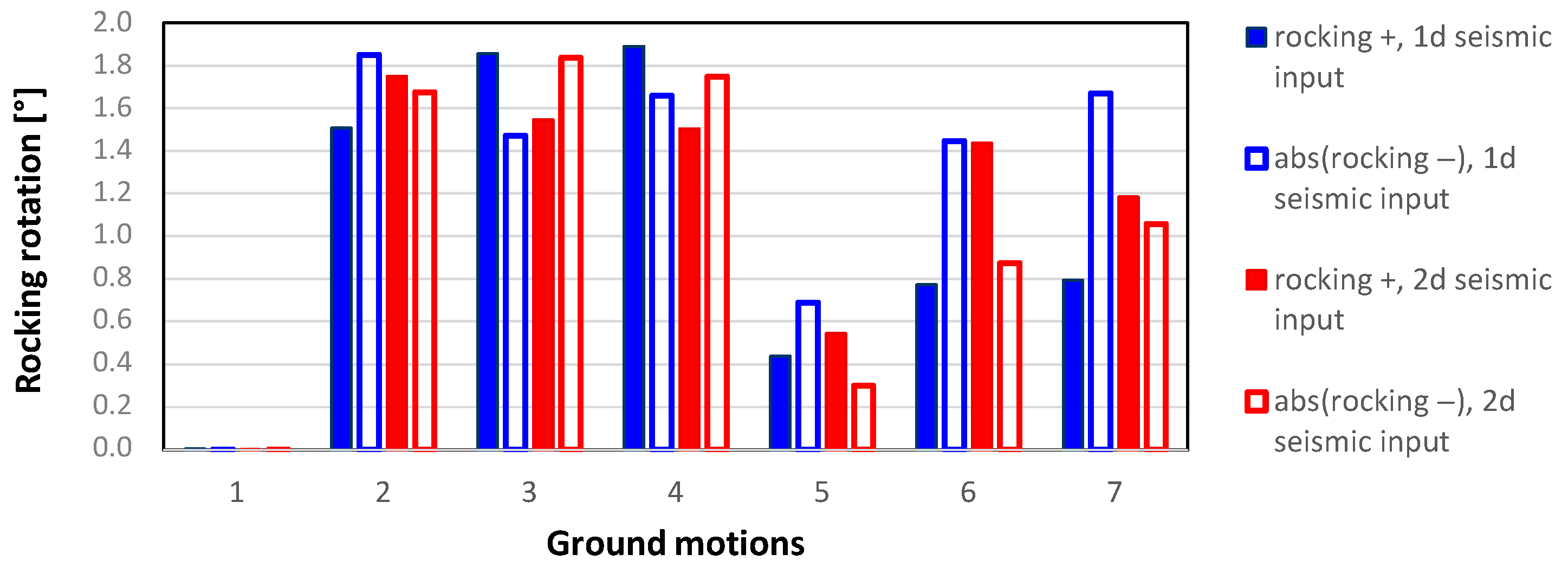 With reference to Model A, a further investigation has been carried out, consisting of a two-dimensional analysis. The rocking obtained in this latter analysis was similar to that found in the previous analysis; the sliding, instead, was much larger than that provided by the 1d input. As a consequence, the Safety Index, found as the ratio between the capacity of the system and its dynamic response, changes very much, going from 1d to 2d seismic input.