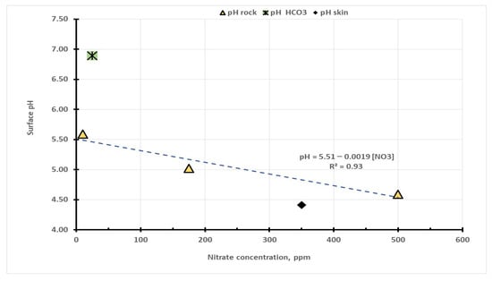 Figure 5 as a function of the nitrate concentration from the Quantab test strips. At zero nitrate concentration (the intercept value in Equation (4)) the surface pH was 5.51, and the pH fell by 0.19 per hundred-fold increase in the nitrate concentration. The change in pH represents an increase of 155% in surface acidity per 100 ppm increase in the nitrate concentration (