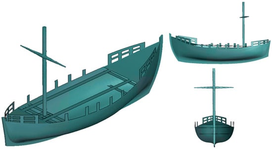 The ship used in the simulation is a scaled model of a Kyrenia-type merchant vessel from the 4th century BC. This type was selected due to its well-documented hull geometry and its frequent use in maritime archaeological studies [17]. The original virtual model of the Kyrenia ship, measuring 14.621 m in length with a displacement of 22 tons (comprising a 9-ton lightship and 13 tons of deadweight, including crew and cargo, was developed by Rudan et al. [17]. For the purposes of this analysis, the model is uniformly scaled in all dimensions, using a linear scaling factor of 0.83 to reflect the smaller capacity of the Žirje shipwreck. As a result of this transformation, the simulated ship measures 12.125 m in length. Its deadweight is estimated at 6 tons. The freeboard is adjusted from the Kyrenia’s original 0.8 m to 0.65 m, based on proportional reduction and archaeological assumptions regarding the ship’s size and loading conditions [18]. No internal reinforcements or compartments are modelled at this stage, focusing on overall hull behaviour under hydrostatic and dynamic loading conditions.