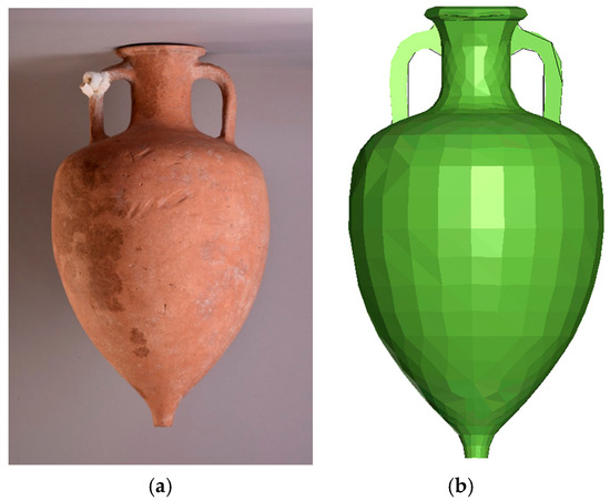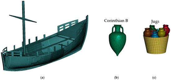 The presence of Corinthian B-type amphorae, Figure 2a, is inferred based on typological and chronological consistency with the Classical period. Similar amphorae from archaeological contexts in the central Mediterranean have shown chemical traces of wine and oil, supporting their interpretation as containers for bulk transport of such commodities [20]. These amphorae, typically measuring around 65 cm in height and 35 cm in width, are characterised by their robust shape and suitability for dense stacking in ship cargo holds. While direct evidence for Corinthian B amphorae on the original Kyrenia shipwreck site has not been confirmed, their dating corresponds to the period of Kyrenia’s activity, and their morphology aligns with cargo configurations typical of such merchant vessels. The inclusion of amphorae in the model is based on common archaeological methodology. When direct material evidence is incomplete or missing, researchers often rely on the typology of amphorae, such as their shape, dimensions, and origin, to reconstruct the likely cargo composition and arrangement. This approach is widely accepted in maritime archaeology and allows for a plausible reconstruction of cargo even when only fragmentary physical remains are available [21]. The amphora model was constructed based on the real exhibit, Figure 2a, using solid tetrahedral elements, as shown in Figure 2b, to capture the complex curved geometry of the Corinthian B-type vessel. However, to optimise computational performance and focus on ship–cargo interaction rather than amphora deformation, the amphorae were assigned rigid material properties. This assumption allows for faster simulations while maintaining realistic mass and volume, as the objective is not to evaluate amphora cracking or fracture behaviour, but to study how the cargo contributes to the shipwreck dynamics. This approach aligns with archaeological interpretations, where most of the amphorae recovered from the site were found intact or with minimal damage, suggesting the ship structure failed rather than the cargo itself.