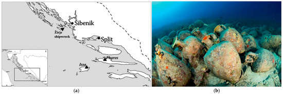 Žirje shipwreck site: (a) Position of the shipwreck, (b) main concentration of amphorae [16].