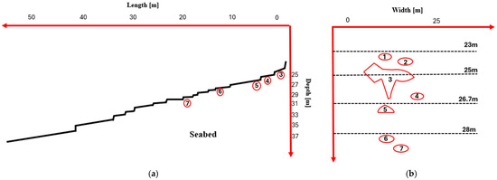 The main concentration of the amphorae was recorded at a depth between 23 and 25 m, with a larger group located just below 25 m. Some amphorae were found scattered up to 20 m away from the main concentration, suggesting they were displaced either by the sinking process or subsequent underwater currents. Detailed sketches showing the positions of the main concentrations of amphorae on the seabed, both in horizontal and lateral views, are presented in Figure 5a and b.
