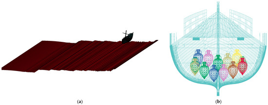Final numerical model of the Žirje shipwreck simulation: (a) isometric view, (b) section cu through the hull and cargo.”.