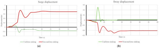 Comparison of simulated vessel motions for the Žirje shipwreck under uniform and non-uniform sinking: (a) surge (b) sway.