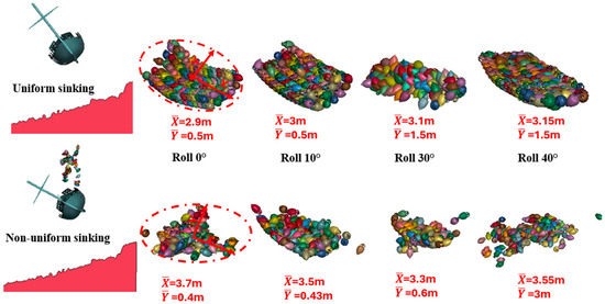 As shown in Figure 10, yaw variation had a comparatively minor effect on amphora dispersion in both uniform and non-uniform sinking scenarios. In uniform sinking, even the maximum yaw angle (20°) resulted in negligible cargo scatter. In contrast, when combined with roll angles under non-uniform sinking, the yaw contributed to the widest dispersion patterns. However, in all uniform cases, the amphorae remained confined within the ship, further supporting the importance of asymmetrical sinking dynamics.
