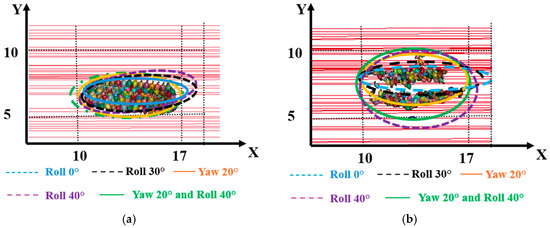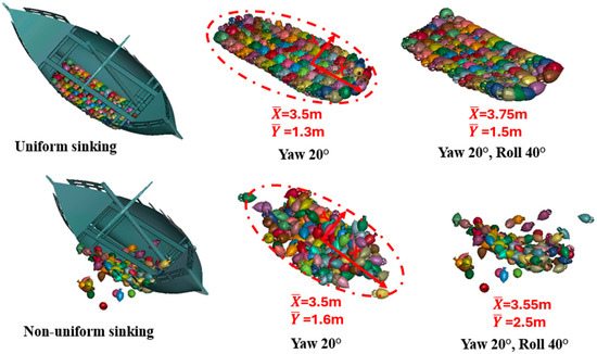 Distinct differences in amphorae dispersion are observed between uniform and non-uniform sinking scenarios, as shown in Figure 11. In the uniform case, the scatter remains narrow and primarily aligned with the ship’s longitudinal axis, with limited variation across different angles. In contrast, non-uniform sinking produces a broader and more irregular distribution, particularly at higher roll and yaw angles, resulting in wider lateral spread and greater overall displacement.