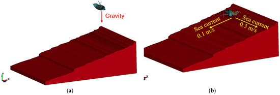 The applied sea current forces are based on hydrodynamic data from the central Adriatic. While bottom currents in this region can temporarily exceed 0.3 m/s during strong wind events, their short duration and the shape of the amphorae suggest limited but important post-impact influence. In the simulation, these conditions are modelled as transient accelerations ranging from 0.25 to 0.4 m/s2 in the horizontal (X) direction and 0.05 to 0.1 m/s2 in the vertical (Z) direction, Figure 12b. These were applied for up to 20 s following seabed contact, representing the entrainment phase prior to stabilisation due to sediment and friction [27].