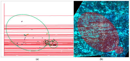 Amphorae dispersion at the Žirje site: (a) numerical simulation results, (b) archaeological findings documented by photogrammetry.