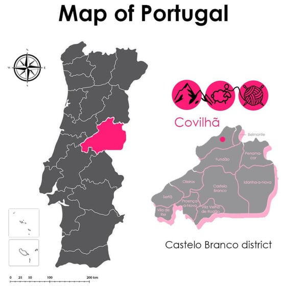 Covilhã, a city with a deep-rooted connection to the textile industry, is located in the district of Castelo Branco, in the Beira Interior region of central-eastern Portugal (Figure 1), situated on the slopes of Serra da Estrela, a place that offers ideal conditions for wool production due to its rich pastures [3,4]. Despite recent developments to safeguard this inheritance, uncovering the methods used to produce and dye textiles in Covilhã during the 18th century remains challenging, as documentation regarding the 121 years of production remains scattered around various archives and collections [1].