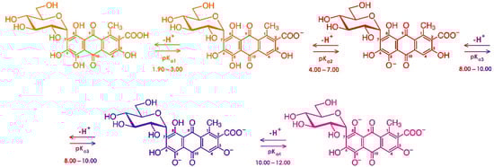 A possible acid-base equilibrium is shown in Figure 3, demonstrating the changeability of this chromophore under different pH values. These transformations highlight the chromophore’s strong dependence on hydroxyl positioning, a trait shared among hydroxyanthraquinones [39,42]. Additionally, the arrangement of these hydroxyl groups makes carminic acid prone to complexation with metal ions, such as Al3+ [37,44].