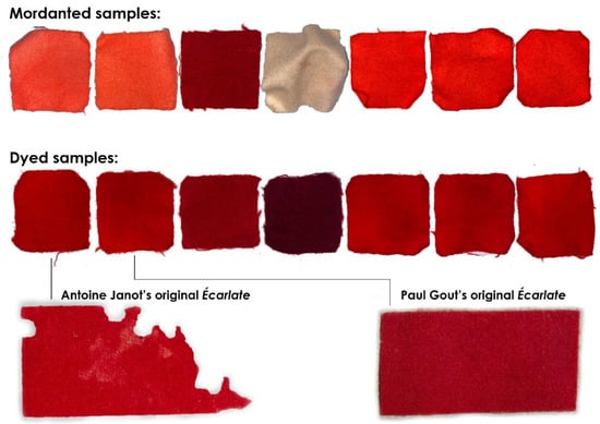 From the recipes listed, seven were selected for reconstruction: Antoine Janot’s Écarlate; Paul Gout’s Écarlate in his first Memoir; Miguel Suárez’s Escarlata color de fuego and Escarlata de Venícia; and Luis Fernández’s Escarlata, Color de Zereza, and Color de Punzó (Figure 4). The selection of these recipes was based mainly considering the name of the recipe, “Scarlet”, in the case of the French master dyers. For the Spanish recipes, there are no samples available that would allow verifying the original colour, and so all recipes were selected to be reconstructed.