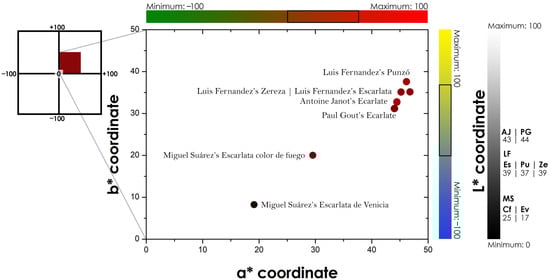 Colorimetry measurements from the samples obtained by the historical reproduction of the masters’ written recipes. AJ—Antoine Janot’s Écarlate; PG—Paul Gout’s Écarlate; LF—Luís Fernández; Es—Escarlata; Pu—Punzó; Ze—Zereza; MS—Miguel Suárez; Cf—Escarlata color de fuego; Ev—Escarlata de Venícia. ©Mara Espírito Santo 2024.